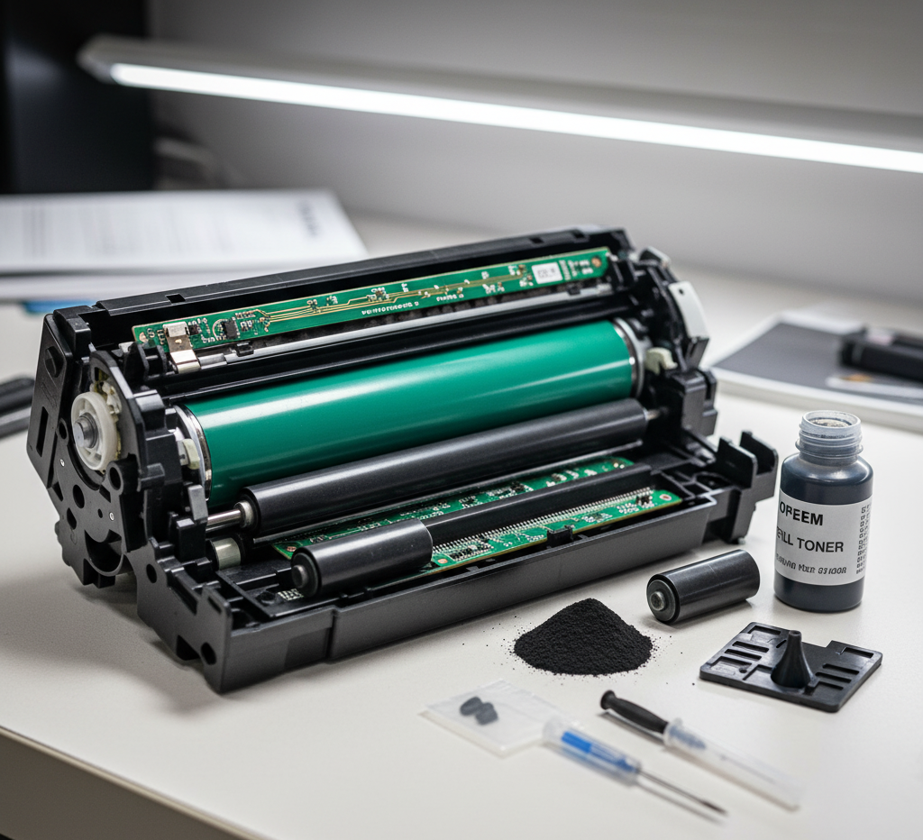 Most toner cartridges bear integrated compartments that serve to hold the toner, control it as well as monitor the circuitry